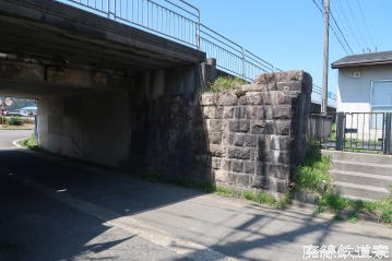 中ノ郷駅跡の手前の架道橋に石積の橋台がある。半分は道路からはみ出ている。道路と完全に一致していたわけではないようだ。