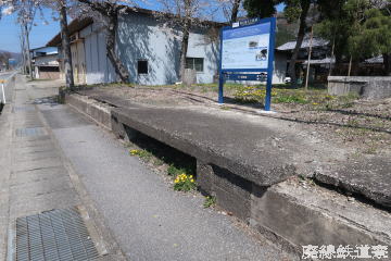中ノ郷駅跡から4キロ半余りで柳ヶ瀬駅跡となる。附近の倉庫にレールがある。バス待合所の裏にホームらしき盛土があり石垣もある。用地杭と思われる杭もある。