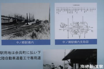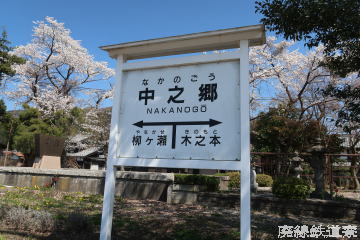 中ノ郷駅跡となる。ホームらしい土台があるが、廃線後用地売却後に建った建屋の土台かもしれない。一部に鉄道のホームらしい部分もある。駅名標を模した記念碑がある。駅名の「中ノ郷」ではなく、地名の「中之郷」になっている。隣駅表記も木之本になっている。かつては機関車解結基地であったことが記載されている。