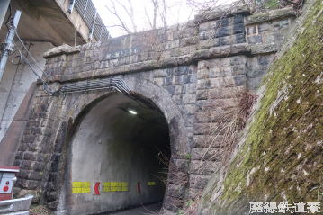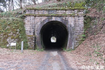 未舗装の路盤が続き、すぐに小刀根トンネル(延長56m)となる。壁柱がある重厚な石積みで、その上には落石止めがある。要石には「明治十四年」とある。土木学会選奨土木遺産で、記念碑がある。原形を保つトンネルとしては日本最古だそうで、D51もこのトンネルに合わせたとの事。