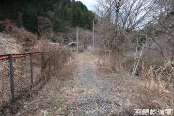 南西に針路を変え、下り勾配が続く。民家や農地が増えてくる。麻生口から2キロ程で線路跡は道路から外れ、写真奥へまっすぐ進む。