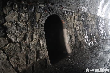 トンネル内部。下部はレンガ積みで退避坑もある。トンネル敦賀側も石積みのポータルである。記念碑がある。