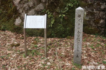 刀根集落の公民館には、この先にある刀根トンネルの道路化拡張時に外された要石が保存されている。「起工明治十三年(1880年)六月、竣工十四年八月、四等技手 長谷川謹介」とある