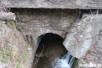 疋田駅跡からしばらく生活道路、その先は住宅が建っている。小川を渡る小橋梁はレンガ積みで当時の物だろう。