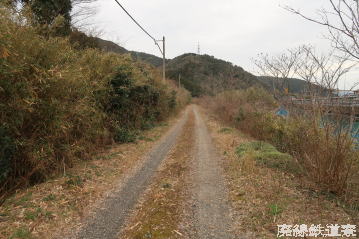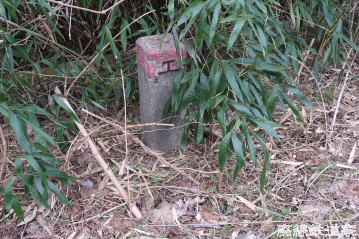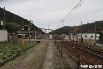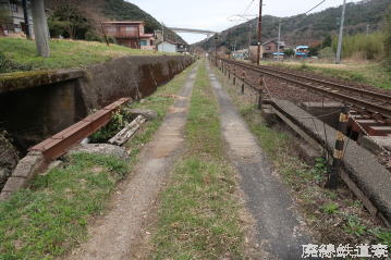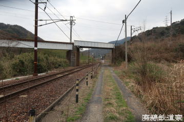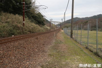 その先で上り線と交叉した後から、現役線の西隣に小道が出てくるが、線路跡なのか現役線を工事した際の作業道なのか判らない。写真左に現役線と小道を挟んで境界標があるので、少なくともこの小道はJRの用地のはずである。