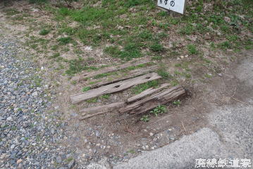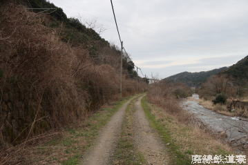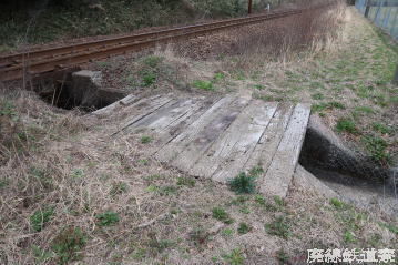 ほぼ現役線と高低差がなくなる。現役線と並行して小橋梁がある。マクラギが渡してある。この先路盤は現役線に吸収される。